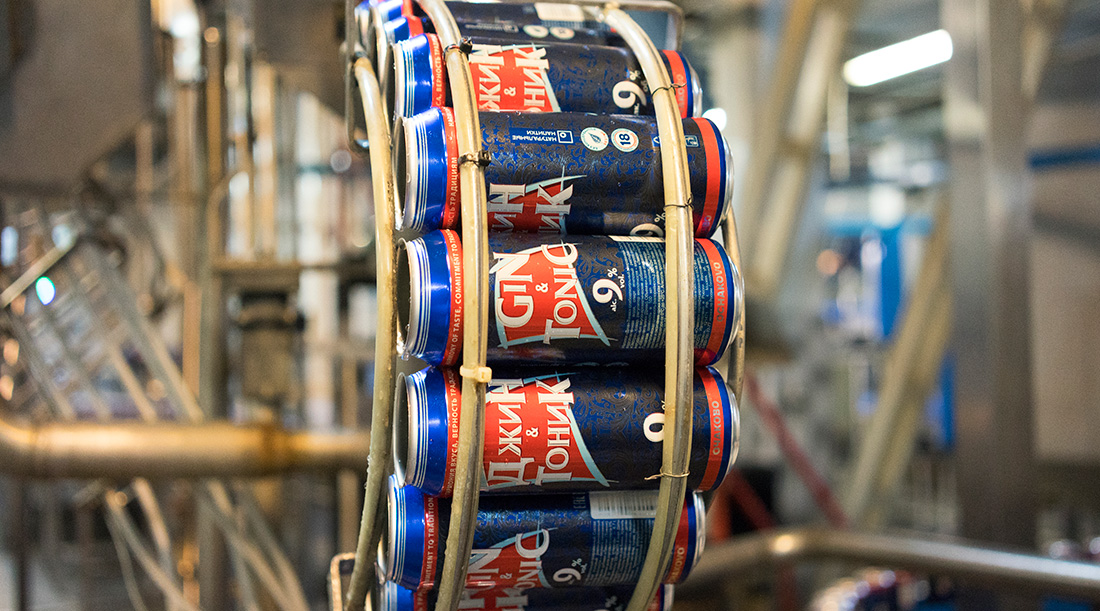 Карбонизируем «Джин-тоник», то есть добавляем углекислый газ, после чего разливаем в банки и пластиковые бутылки. В ПЭТ-таре коктейль хранится 9 месяцев, в банке — 18. Консервантов нет: «Джин-тоник» хранится долго за счет пастеризации.